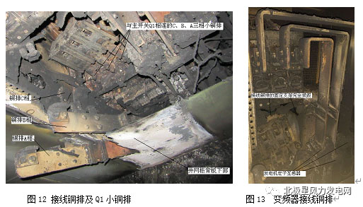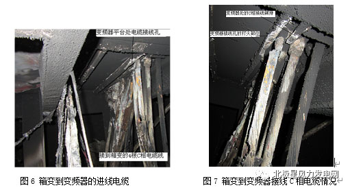 在電纜進(jìn)線、變頻器銅排處,C相對(duì)地短路的時(shí)間遠(yuǎn)超過A、B相,因電流大,發(fā)熱大,部件燒毀越嚴(yán)重。所以,箱變到變頻器接線電纜的C相變頻器銅排(接地點(diǎn))處燒毀程度比其他兩相嚴(yán)重;而與它并聯(lián)的其他負(fù)載線路,則是C相燒毀程度比其他兩相輕。從另一個(gè)側(cè)面說明了:箱變到變頻器接線的接線銅排在變頻器接線進(jìn)口平臺(tái)處發(fā)生短路是造成此次事故的原因。