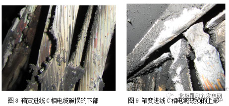 箱變連接變頻器銅排的4根C相電纜,如圖6所示。其中一根有兩處燒出了大的缺口,如圖7、圖8所示,C相的4根多股銅芯電纜不僅絕緣皮已全部化為灰燼。在變頻器接地平臺(tái)的進(jìn)線口處,其中有兩根電纜的銅芯損毀嚴(yán)重,剩余部分不到一半,如圖9所示。一根電纜的上下兩缺口之間的距離正好是C相電纜下移距離,這就是說,C相電纜在下移之前,下缺口位置是與變頻器的接地平臺(tái)齊平的。由此可以推斷,C相電纜在下移之前,電纜與接地平臺(tái)之間應(yīng)該存在嚴(yán)重打火放電,致使在電纜上燒出了巨大的缺口,如圖7所示。