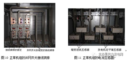 圖10為事故前機(jī)組的變頻器并網(wǎng)開關(guān)銅排狀況,圖11為測(cè)量機(jī)組、發(fā)電機(jī)定子電流大小的六個(gè)互感器,與圖12、13比較可知:事故機(jī)組變頻器并網(wǎng)柜燒毀嚴(yán)重,A、B、C三相進(jìn)線電纜的銅排與并網(wǎng)開關(guān)Q11上銅排的固定件,以及在機(jī)殼上的銅排固定件完全損毀、脫落。A、B兩相銅排上端燒毀狀況基本一致,C相銅排上端燒毀狀況比A、B兩相嚴(yán)重,如圖12所示。