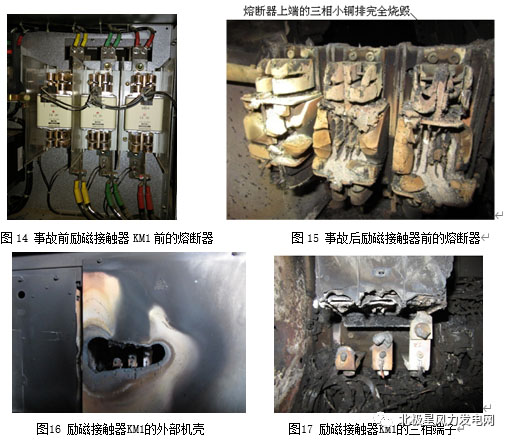 如圖16和圖17所示,勵(lì)磁接觸器(KM1)處A、B兩相外面的機(jī)殼和這兩相的端子,其燒毀狀況較C相嚴(yán)重。