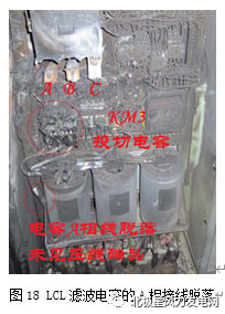 濾波器LCL的電容直接與勵(lì)磁接觸相并聯(lián),與勵(lì)磁接觸器狀況類似,A、B兩相燒毀較C相嚴(yán)重,其中,A相的固定端被燒毀后,A相接線脫落,A相的接線端子也被燒毀。如圖18所示。