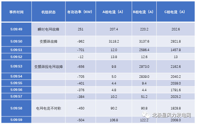 事發(fā)時(shí)的嚴(yán)重拉弧打火,還造成了三相電流不平衡超過設(shè)定值,此故障前后的三相電流值參見表1。因此,在5:09:58機(jī)組報(bào)“電網(wǎng)電流不對(duì)稱”故障。