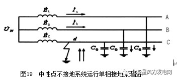 當(dāng)C相接地時(shí),如圖19所示,原本對(duì)稱的三相,這時(shí)對(duì)地通路不再對(duì)稱。由于中性點(diǎn)浮置,此時(shí)的中性點(diǎn)電位將較原來發(fā)生偏移 [2]。