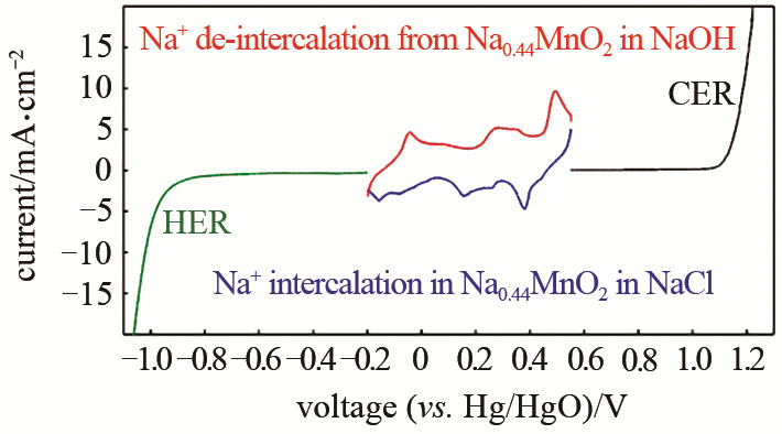 對(duì)錳酸鈉電極進(jìn)行線性伏安掃描測試,如圖8所示,其氧化還原峰正好位于HER和CER的中間區(qū)域。錳酸鈉在水系溶液中具有良好的鈉離子嵌入脫出能力,因此非常適合作為ECPBs。
