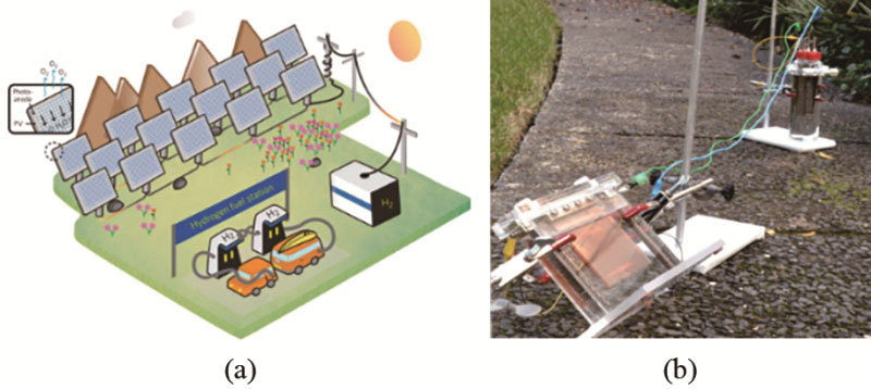 圖7 (a) PEC-PV-分步法集中制氫加氫站的概念圖;(b) 戶外分步法PEC-PV單電池串聯(lián)結(jié)構(gòu)演示電池