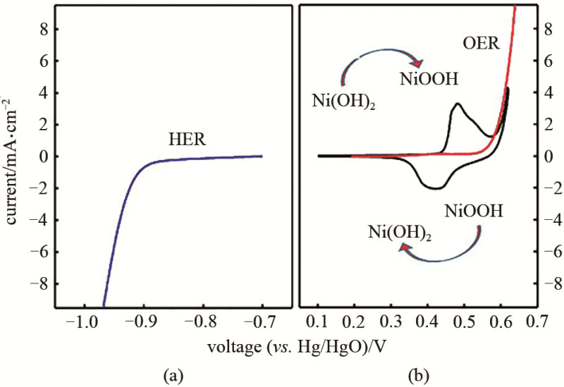 圖6 氫氧化鎳電極在掃速為5 mV/s時(shí)的析氫(HER)循環(huán)伏安曲線(a)和商業(yè)化電極(鉑包覆鈦網(wǎng);二氧化釕包覆鈦網(wǎng))在掃速為5 mV/s時(shí)析氧(OER)線性掃描伏安曲線(b)