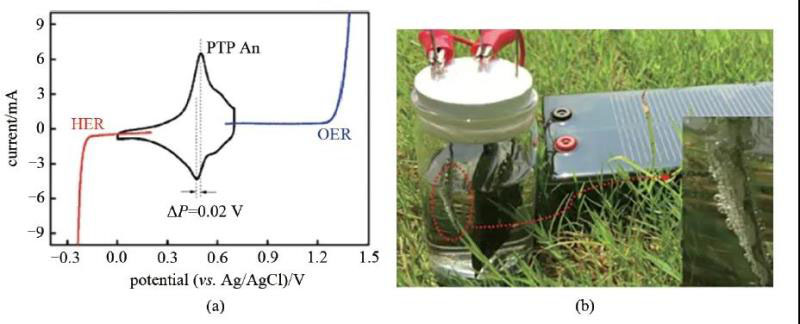 圖5 (a) PTPAn的CV曲線,HER的LSV曲線(紅線)及OER的LSV曲線(藍(lán)線);(b) 演示實(shí)驗(yàn)照片