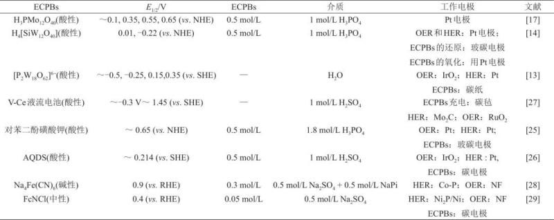 這些雜多酸通常具有很高的分子量,磷鉬酸分子量高達(dá)1843,硅鎢酸分子量為2880,因此質(zhì)量能量密度低。此外,雜多酸所使用的鉬、鎢等元素的成本也較高,因此,在ECPBs的設(shè)計(jì)和選擇上,除了考慮其氧化還原電位的適宜性,還應(yīng)該向低分子量、元素儲(chǔ)量豐富廉價(jià)的方向發(fā)展。對(duì)于陰極的HER,在規(guī)?;瘧?yīng)用時(shí)可以選擇耐酸腐蝕的過渡金屬化合物代替Pt,例如Ni5P4、Ni2P、Mo2C、MoS2、CoP等。