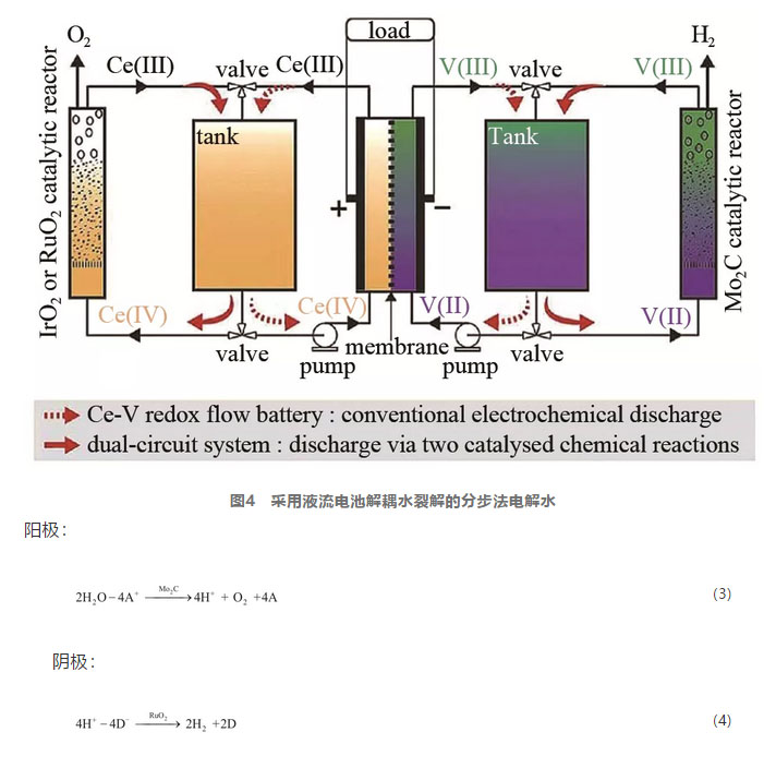 使用ECPBs進(jìn)行解耦水分解時(shí),由于H2和O2并不是同時(shí)產(chǎn)生的,因此氣體的純度很高。但是這也意味著與傳統(tǒng)電解水相比,產(chǎn)生H2和O2所需要的時(shí)間將翻倍。為了滿足分步電解水并減少總時(shí)間消耗,Amstutz等報(bào)道了一種包含氧化還原流動(dòng)電池模塊的新型分步法電解水設(shè)計(jì)。與常規(guī)的使用單個(gè)ECPBs不同,這里的ECPBs是由兩種氧化還原介質(zhì)V(Ⅲ)/(Ⅱ)和Ce(Ⅳ)/(Ⅲ)構(gòu)成的液流電池模塊構(gòu)成,系統(tǒng)的結(jié)構(gòu)如圖4所示,其中模塊Ⅰ是傳統(tǒng)氧化還原流動(dòng)電池。在中間位置的氧化還原液流電池在充電過程中,正極側(cè)Ce(Ⅲ)在1.0 mol/L H2SO4介質(zhì)中被氧化為Ce(Ⅳ),負(fù)極側(cè)V(Ⅲ)還原為V(Ⅱ)。在催化劑存在的情況下,Ce和V能夠生成氧氣和氫氣。然后將這些正極電解液和負(fù)極電解液分別泵入各自的催化床,在RuO2上生成O2,在Mo2C上生成H2。反應(yīng)方程如式(3)、式(4)所示。