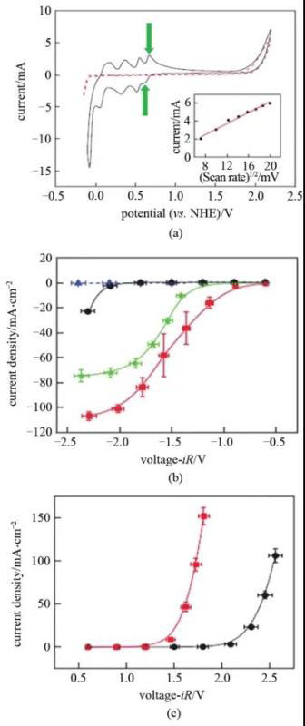 圖3 (a) 循環(huán)伏安曲線:1.0 mol/L H3PO4+0.5 mol/L磷鉬酸(黑色),1.0 mol/L H3PO4(紅色);(b) 在兩電極體系中HER在鉑電極(有ECPB紅色,無ECPB黑色)和鉑碳電極(有ECPB綠色,無ECPB藍(lán)色)上的極化曲線;(c) 在兩電極體系中OER在鉑電極上的極化曲線:有ECPB(紅色),無ECPB(黑色)