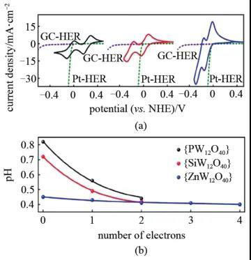 在酸性介質(zhì)下,常使用雜多酸作為ECPBs。例如分子結(jié)構(gòu)式為HnXW12O40(X= P5+、Si4+、 Zn2+)的雜多酸溶液都可作為ECPBs。圖2(a)給出了{(lán)PW12O40}、{SiW12O40}、{ZnW12O40}的循環(huán)伏安曲線,從圖中可見,其氧化還原電位電位均位于HER和OER之間,適合作為ECPBs。圖2(b)給出了這些雜多酸的轉(zhuǎn)移電子數(shù)隨溶液pH值變化的情況。