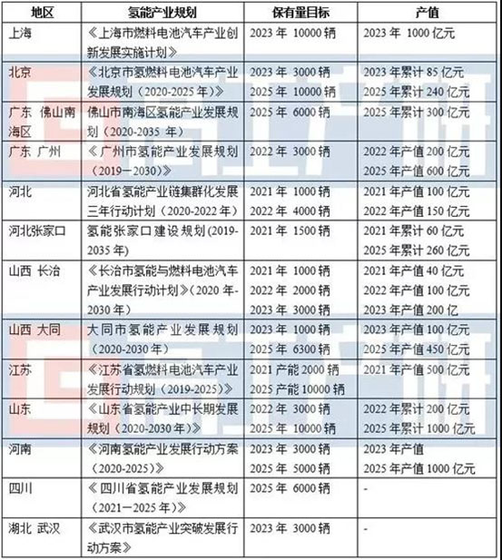 具體來看,據不完全統計,僅上海、北京、廣東、山西、山東、江蘇、河北、河南、四川、湖北等十個省份及直轄市明確規(guī)劃(如下圖所示),2023/2025年燃料電池汽車保有量分別達到3.5萬輛和7.63萬輛。2020年底國內燃料電池汽車保有量在8000輛左右,這意味著未來三年年均銷量需達到9000輛以上,未來五年年均銷量在13660輛以上。