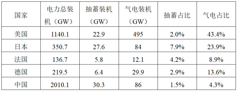 表1 2019年各國抽水蓄能及氣電裝機情況