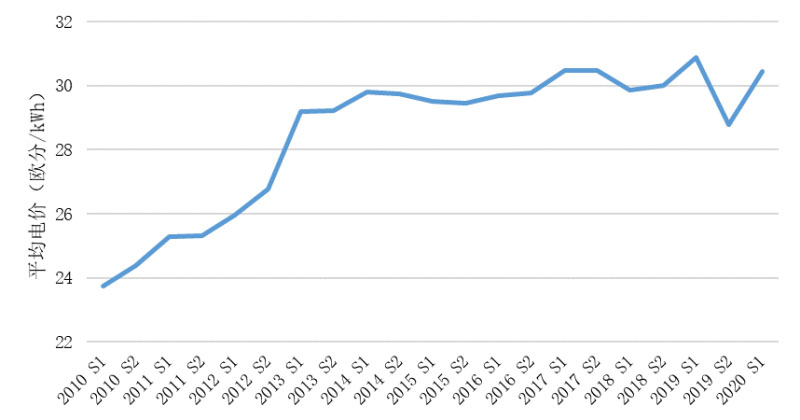 圖4 2010年上半年(2010 S1)~2020年上半年(2020 S1)德國平均電價變化趨勢(數(shù)據(jù)來源:statista)