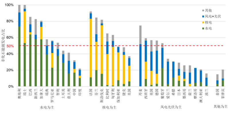 充分發(fā)揮水電、核電等出力穩(wěn)定的清潔能源電力的作用。從35個典型國家非化石能源發(fā)電占比的統(tǒng)計結(jié)果來看,非化石能源發(fā)電占比超過50%的共有18個國家,這18個國家非化石能源發(fā)電量占比平均達(dá)到73.4%,其中水電和核電合計貢獻(xiàn)了51.6%的占比,風(fēng)電、光伏貢獻(xiàn)的占比不足15%。水電、核電等傳統(tǒng)非化石能源出力穩(wěn)定、技術(shù)成熟,可作為替代化石能源發(fā)電的主力電源。