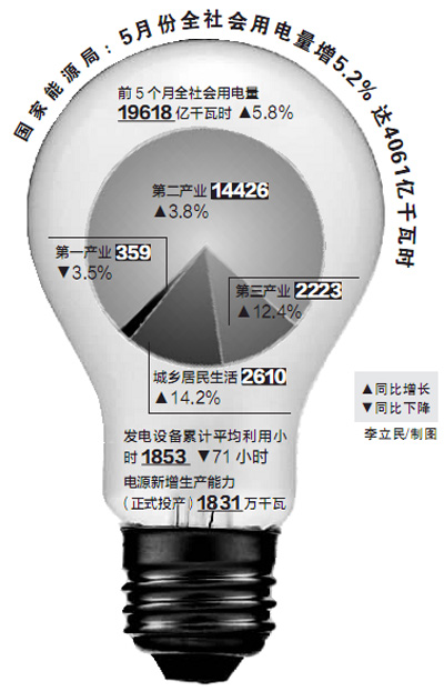 6月13日召開的2012年全國(guó)電力迎峰度夏新聞發(fā)布會(huì)公布數(shù)據(jù)顯示,今年前5個(gè)月,全社會(huì)用電量為1.96萬(wàn)億千瓦時(shí),同比增長(zhǎng)5.8%,增幅回落6.2%;5月份,全社會(huì)用電量4061億千瓦時(shí),同比增長(zhǎng)5.2%,增幅回落5.6%。兩者均為近幾年較低水平。