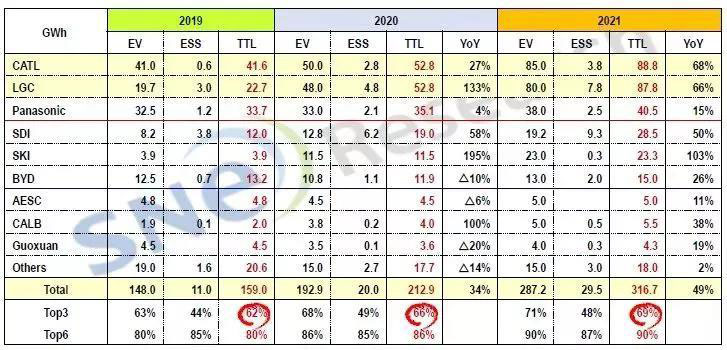 (表中EV即電動(dòng)車用的動(dòng)力電池產(chǎn)能,數(shù)據(jù)來自韓國市場(chǎng)調(diào)研機(jī)構(gòu)SNE Research)