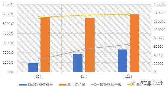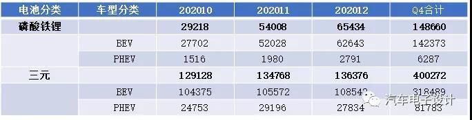 單從電池來看,我們可以發(fā)現(xiàn),磷酸鐵鋰目前在BEV里面的應(yīng)用非??欤壳?2月達到了6.54萬臺,為三元13.63萬臺的1/2不到一些。月度裝車的數(shù)量從10月的0.98GWh(14.7%)拉升到2.32GWh(28%)。相對而言三元電池的裝機臺數(shù)比較平均,10月12.9萬臺到12月也就13.63萬臺,裝車量卡在了6GWh左右。