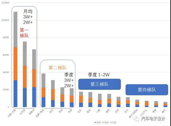 從整車來看,目前已經(jīng)衍生出來幾個梯隊,按照產(chǎn)量的數(shù)據(jù)來排名,形成第一梯隊月產(chǎn)2萬+,第二梯隊季產(chǎn)2萬和季度產(chǎn)1.5萬的三個梯隊。