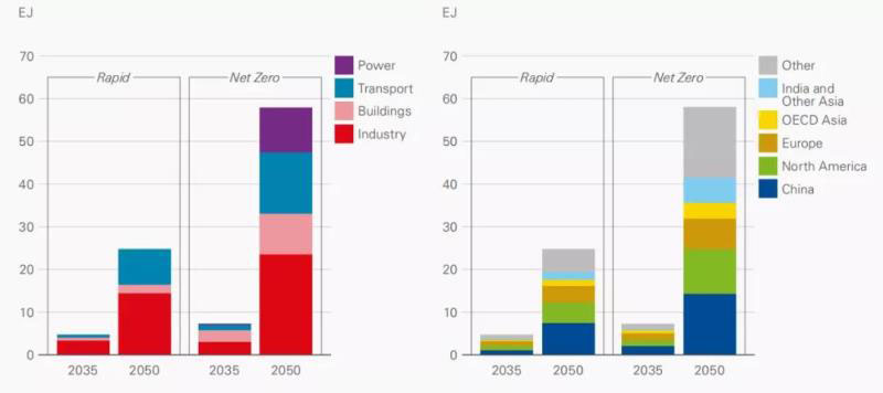 在BP《世界能源展望2020》的快速轉(zhuǎn)型情景和凈零排放情景中,到2050年全球95%以上的氫為綠氫和藍(lán)氫,其余是未配備CCUS的、由天然氣或煤炭制取的灰氫。BP認(rèn)為,隨著技術(shù)發(fā)展、成本下降及碳價上漲,氫能將在2035~2050年顯著增長(見圖7)。到2050年,氫能在終端消費中占比將達到7%(快速轉(zhuǎn)型情景)或16%(凈零排放情景)左右。在快速轉(zhuǎn)型情景中,中國和發(fā)達經(jīng)濟體中氫能發(fā)展較為突出;凈零排放情景中,氫能適用范圍更廣,在印度和亞洲其他發(fā)展中國家也有顯著增長。