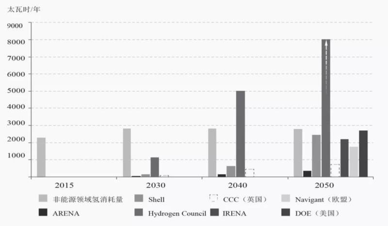 綜合各大機構(gòu)對全球氫市場的展望(見圖6),國際可再生能源署、殼牌、澳大利亞可再生能源署等機構(gòu)認(rèn)為,到2050年全球氫市場規(guī)模將達到500~2000太瓦時;而國際氫能委員會則認(rèn)為,屆時氫市場有望達到16100太瓦時,占世界能源總消費的18%。也就是說,如果從目前氫在非能源領(lǐng)域的消耗水平來看其未來的絕對產(chǎn)量,根據(jù)最樂觀的預(yù)測,到2050年氫產(chǎn)量有望增長6.5倍,或者說到2050年的復(fù)合年均增長率約為6%。