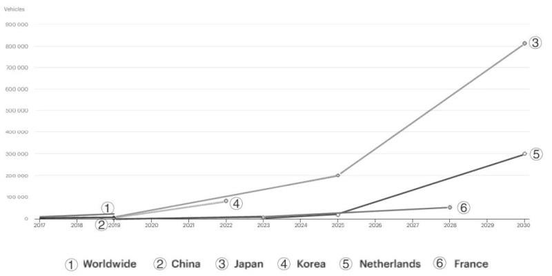 圖4 全球及部分國家燃料電池汽車部署情況和發(fā)展目標(biāo)