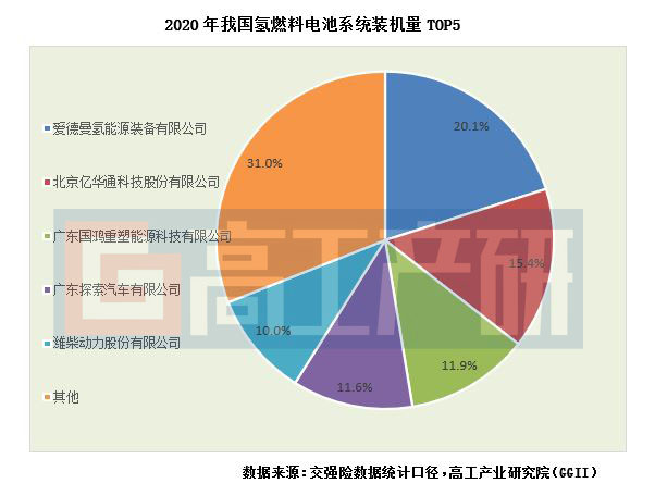 從裝機量排名來看,2020年氫燃料電池系統(tǒng)裝機量占比最高的是愛德曼氫能,占比20.1%。排名前五的企業(yè)分別為愛德曼氫能、億華通、國鴻重塑、探索汽車、濰柴動力,前五家企業(yè)裝機量占2020年中國氫燃料電池系統(tǒng)裝機量的69%。