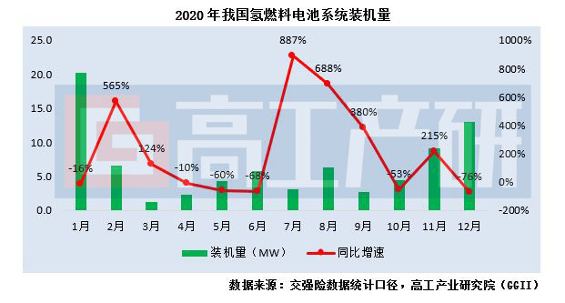 從裝機量來看,2020年我國氫燃料電池系統(tǒng)裝機量約為79.2MW,同比下降37%。其中,氫燃料電池系統(tǒng)在客車上的合計裝機量約為71.7MW,同比增長46%;在專用車上的合計裝機量約為7.5MW,同比下降90%。