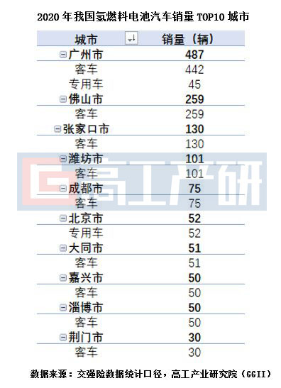從城市分布來看,2020年我國氫燃料電池汽車銷量主要分布在廣州、佛山、張家口、濰坊、成都、北京、大同、嘉興、淄博、荊門,該十城合計銷量為1,285輛,占整體的85.84%。