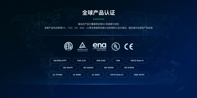 為滿足不同國家地區(qū)的安全標(biāo)準(zhǔn),盛弘30-1000kW全功率范圍儲能變流器產(chǎn)品均已通過第三方認(rèn)證機(jī)構(gòu)認(rèn)證。根據(jù)中國、英國、德國、澳洲和美國電網(wǎng)安全規(guī)范標(biāo)準(zhǔn)進(jìn)行的測試和認(rèn)證,并在美國加州和夏威夷州電網(wǎng)公司、澳洲清潔能源協(xié)會CEC及英國能源網(wǎng)絡(luò)協(xié)會ENA上進(jìn)行列名,滿足智能逆變器對電網(wǎng)的高級支撐能力。50~250kW系列模塊化儲能變流器成為全球首款同時(shí)滿足UL、CPUC 和HECO相應(yīng)規(guī)范的大型并網(wǎng)逆變器,并能同時(shí)滿足并網(wǎng)和離網(wǎng)的應(yīng)用需求。此外,盛弘股份儲能實(shí)驗(yàn)室也同時(shí)成為Intertek和TUV萊茵所認(rèn)可的試驗(yàn)室。