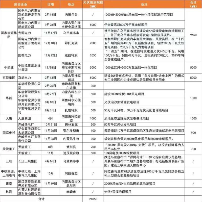 需要特別指出的是,風(fēng)光大省內(nèi)蒙是2020年以來各投資企業(yè)最為青睞的省份之一,據(jù)統(tǒng)計(jì),2020年內(nèi)蒙簽約的光伏項(xiàng)目規(guī)模將近25GW,幾乎囊括了國家能源集團(tuán)、華能、大唐、國家電投、三峽、中核等主流的光伏電站投資商。