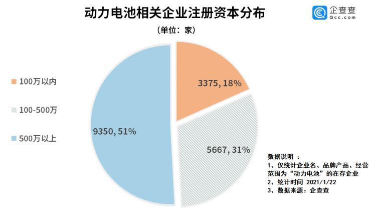 從企業(yè)規(guī)模來看,注冊(cè)資本在500萬以上的動(dòng)力電池相關(guān)企業(yè)占據(jù)了行業(yè)的大多數(shù),共9350家企業(yè),達(dá)到了總量的51%。注冊(cè)資本在100萬以內(nèi)的動(dòng)力電池企業(yè)數(shù)量最少,僅3375家,占比總量的18%。