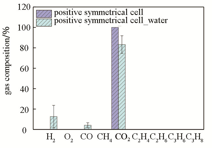 圖4 0.1 C/0.1 C倍率循環(huán)20周后,GC色譜檢測(cè)到的全電池、負(fù)極對(duì)稱電池及正極對(duì)稱電池中所生成的氣體成分