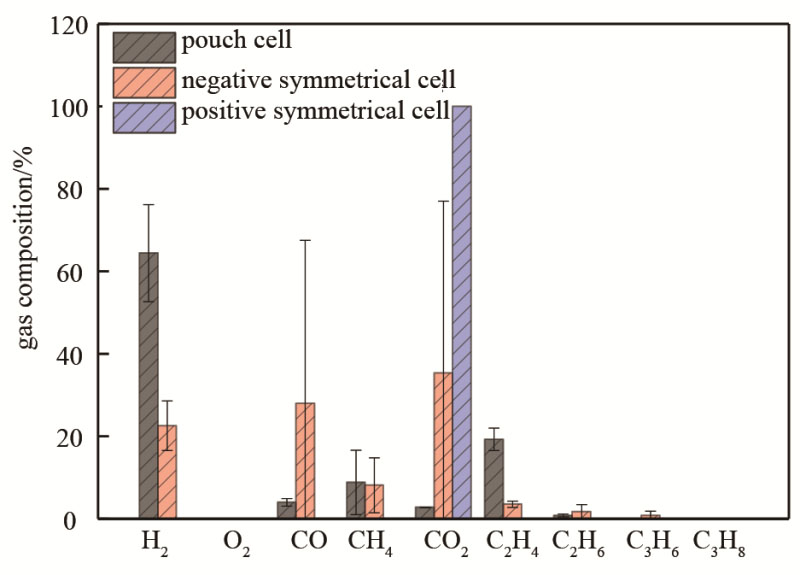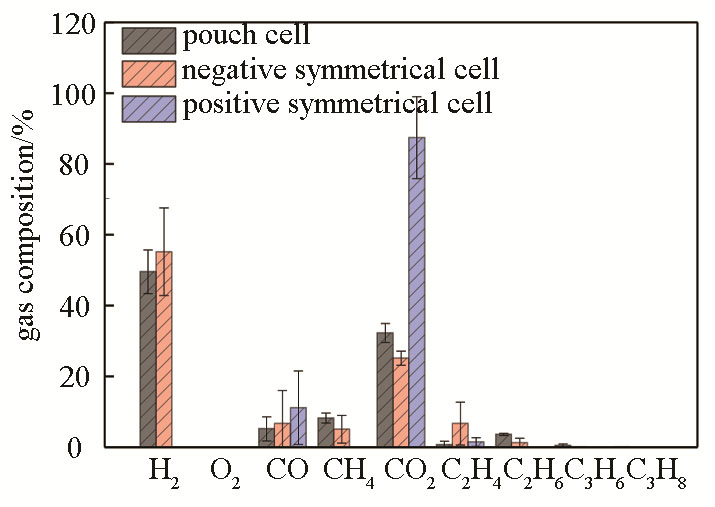 圖6 GC色譜檢測(cè)到的全電池、負(fù)極對(duì)稱電池及正極對(duì)稱電池過(guò)充后所生成的氣體成分