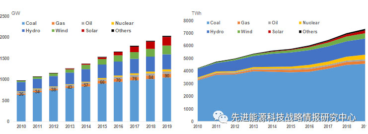 圖1 2010-2019年中國電力裝機容量(左圖,單位:吉瓦)和發(fā)電量(右圖,單位:太瓦時)