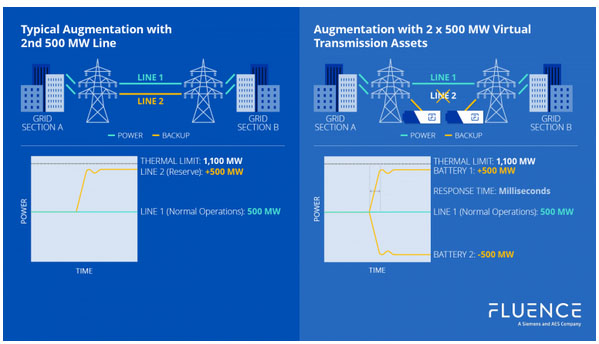 虛擬輸電是指采用專門部署的電池儲能系統(tǒng)系統(tǒng)代替輸電線路,以提供容量、服務(wù)和功能的組合,從而實現(xiàn)比傳統(tǒng)電力解決方案更大的價值。虛擬輸電項目可以采取單一資產(chǎn)串聯(lián)部署的能源資產(chǎn)組合(作為“虛擬輸電線路”)的形式來模擬電網(wǎng)的電力線路,或者作為電力系統(tǒng)的資產(chǎn)組合。關(guān)鍵是電網(wǎng)需要這樣的電池儲能系統(tǒng)來提供: