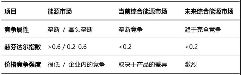市場結(jié)構(gòu)包括壟斷、寡頭壟斷、壟斷競爭和完全競爭等四大類。從本質(zhì)上講,綜合能源服務是競爭性市場業(yè)務,綜合能源服務市場應屬于完全競爭市場。但是,傳統(tǒng)能源市場集中度高,可以對行業(yè)施加經(jīng)濟力量的企業(yè)較多。以這些企業(yè)為主體,轉(zhuǎn)型綜合能源服務商,必將使綜合能源服務市場集中度快速上升,但不會高于傳統(tǒng)能源市場。由于缺乏相關統(tǒng)計數(shù)據(jù),綜合能源服務市場企業(yè)集中度或赫芬達爾指數(shù)難以計算,無法確切知曉其市場結(jié)構(gòu),根據(jù)推斷,應處于寡頭壟斷和完全競爭之間,即壟斷競爭,而且向完全競爭轉(zhuǎn)型不可能一蹴而就。