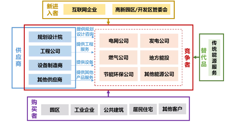 總體來看,由電網(wǎng)公司、發(fā)電公司、燃氣公司、地方能投等構(gòu)成的投資主體,以及由規(guī)劃設計院、工程公司、設備制造商等構(gòu)成的供應商,是該行業(yè)的主要競爭力來源。以互聯(lián)網(wǎng)企業(yè)和高新園區(qū)管委會為主要代表的新進入者正在向綜合能源服務市場緩慢滲透。購買者的溢價能力不強,受制于能源信息的不充分公開透明。綜合能源服務和傳統(tǒng)能源服務互為替代品,傳統(tǒng)能源服務的競爭力正逐漸喪失。