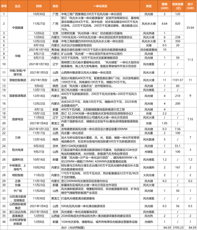 據(jù)光伏們根據(jù)公開資料不完全統(tǒng)計(jì),2020年下半年至今有36個(gè)一體化項(xiàng)目簽約落地,規(guī)劃總規(guī)模近85GW,投資總額超過(guò)3700億,且因地制宜,形式多樣,包括風(fēng)光水火儲(chǔ)、風(fēng)光儲(chǔ)、風(fēng)光儲(chǔ)氫一體化等等。