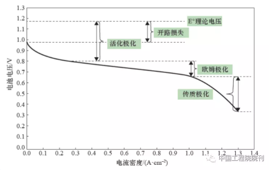 提高燃料電池的功率密度需要從提高性能與減小體積兩方面著手。在性能方面,從燃料電池極化曲線(見圖1)分析可知,通過降低活化極化、歐姆極化、傳質(zhì)極化等多方面入手提高燃料電池性能,這就需要改進(jìn)催化劑、膜、雙極板等關(guān)鍵材料的性能,需要保障電堆的一致性等;在體積方面,需要降低極板等硬件的厚度,提高集成度等。本文將從理論分析及工程實(shí)踐經(jīng)驗(yàn)著手,探討提高功率密度的有效途徑,供從事本領(lǐng)域的研究人員及工程技術(shù)人員參考。
