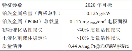 從燃料電池極化曲線可以看出,提高燃料電池性能首先要降低活化極化,而活化極化主要與催化劑活性密切相關(guān)。燃料電池在反應(yīng)過程中,由于氧還原反應(yīng)(ORR)的交換電流密度遠(yuǎn)低于氫氧化反應(yīng)(HOR),一般極化損失主要來自于陰極側(cè)(空氣側(cè))。因此,研究焦點(diǎn)是提高陰極側(cè)催化劑的活性。目前,質(zhì)子交換膜燃料電池中常用的商用催化劑是鉑炭催化劑(Pt/C),是由Pt 的納米顆粒分散到碳粉(如XC-72)載體上的擔(dān)載型催化劑,實(shí)際使用測(cè)試發(fā)現(xiàn)這種商用催化劑在活性、穩(wěn)定性等方面都存在一定不足。美國能源部(DOE)催化劑指標(biāo)如表1所示,研究者通過Pt晶面控制、Pt-M合金催化劑、Pt-M核殼催化劑、Pt表面修飾、Pt單原子層催化劑等多種途徑探索高活性、高穩(wěn)定性催化劑的解決方案,在這些研究中目前可以實(shí)際應(yīng)用的只有Pt-M合金催化劑。