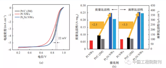 Pt-M催化劑是Pt與過渡金屬形成的合金催化劑,通過過渡金屬催化劑對(duì)Pt的電子與幾何效應(yīng),在提高穩(wěn)定性的同時(shí),質(zhì)量比活性也有所提高;同時(shí),降低了貴金屬的用量,使催化劑成本也得到大幅度降低。如Pt-Co/C、Pt-Fe/C、Pt-Ni/C等二元合金催化劑,展示出了較好的活性與穩(wěn)定性。Chen等人利用鉑鎳合金納米晶體的結(jié)構(gòu)變化,制備了高活性與高穩(wěn)定性Pt3Ni納米籠催化劑,其質(zhì)量比活性與面積比活性分別提高36倍與22倍。在Pt合金催化劑應(yīng)用方面,豐田汽車公司披露了在所發(fā)布的商業(yè)化燃料電池車Mirai上就是采用了Pt-Co合金催化劑,使其催化劑活性提高了1.8倍。中國科學(xué)院大連化學(xué)物理研究所(大連化物所)開發(fā)的Pt3Pd/C催化劑已經(jīng)在燃料電池電堆得到了驗(yàn)證,其性能可以完全替代商品化催化劑;此外,大連化物所還研制出了超小PtCu合金催化劑,其質(zhì)量比活性是目前Pt/C的3.8倍;PtNi納米線合金催化劑質(zhì)量與面積比活性分別達(dá)到Pt/C的2.5倍和3.3倍(見圖2),展示了較好的應(yīng)用前景。