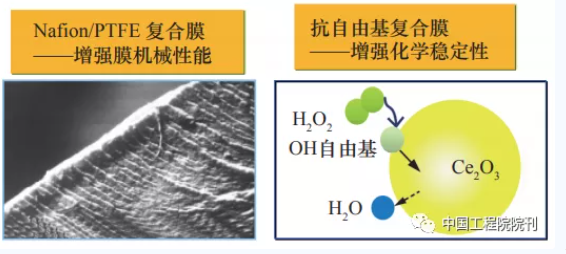機(jī)械增強(qiáng)膜如以多孔薄膜(如多孔PTFE)或纖維為增強(qiáng)骨架、浸漬全氟磺酸樹脂制成復(fù)合增強(qiáng)膜,分布于貫穿多孔膜之間的樹脂保證了質(zhì)子傳導(dǎo),多孔基膜使薄膜的強(qiáng)度提高,同時(shí)尺寸穩(wěn)定性也有大幅改善,如美國高爾公司的復(fù)合膜、中國大連化物所的專利技術(shù)Nafion/PTFE復(fù)合增強(qiáng)膜和碳納米管增強(qiáng)復(fù)合膜等?;瘜W(xué)增強(qiáng)是為了防止由于電化學(xué)反應(yīng)過程中自由基引起的化學(xué)衰減,加入自由基淬滅劑可以在線分解與消除反應(yīng)過程中的自由基,提高耐久性。大連化物所采用在Nafion 膜中加入1 wt.%的CsxH3?xPW12O40/CeO2納米分散顆粒制備出了復(fù)合膜,利用CeO2中的變價(jià)金屬可逆氧化還原性質(zhì)淬滅自由基,CsxH3?xPW12O40的加入在保證了良好的質(zhì)子傳導(dǎo)性同時(shí)還強(qiáng)化了H2O2催化分解能力。南京大學(xué)在質(zhì)子交換膜中加入抗氧化物質(zhì)維生素E,其主要成分α-生育酚不僅能夠捕捉自由基變?yōu)檠趸瘧B(tài),而且能夠在滲透的氫氣幫助下,重新還原,從而提高了燃料電池壽命。