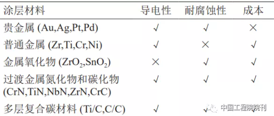 目前常用的金屬雙極板材料是帶有表面涂層的不銹鋼或鈦材。針對(duì)燃料電池不銹鋼雙極板表面耐腐蝕涂層技術(shù),國內(nèi)外進(jìn)行了大量的學(xué)術(shù)研究工作,其涂層材料要保證耐腐蝕、導(dǎo)電兼?zhèn)湫阅?,代表性的涂層材料如?所示。總體來說,表面涂層材料可以分為金屬、金屬化合物與碳涂層三類;金屬類包括貴金屬以及金屬化合物。貴金屬涂層,如金、銀、鉑等,盡管成本高,但由于其優(yōu)越的耐蝕性以及與石墨相似的接觸電阻使其在特殊領(lǐng)域仍有采用。為了降低成本,處理層的厚度盡量減薄,但是要避免針孔。金屬化合物涂層是目前研究較多的表面處理方案,如Ti-N,Cr-N,Cr-C 等表現(xiàn)出較高的應(yīng)用價(jià)值。除了金屬類涂層以外,在金屬雙極板碳類膜方面也有一定探索,如石墨、導(dǎo)電聚合物(聚苯胺、聚吡咯)以及類金剛石等薄膜,豐田汽車公司的專利技術(shù)(US2014356764)披露了具有高導(dǎo)電性的SP2雜化軌道無定型碳的雙極板表面處理技術(shù)。