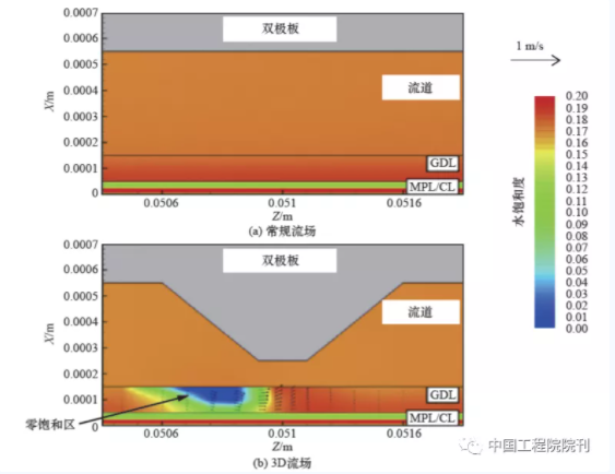 通過模擬計(jì)算可以更進(jìn)一步證實(shí)3D流場(chǎng)強(qiáng)化了流道、擴(kuò)散層的排水能力(見圖5,3D流場(chǎng)在擴(kuò)散層內(nèi)出現(xiàn)了水的零飽和區(qū)),同時(shí)增加了氧氣在催化層的強(qiáng)制對(duì)流,尤其在高電流時(shí)與2D常規(guī)平行溝槽流場(chǎng)比較,燃料電池性能有了很大的提升。