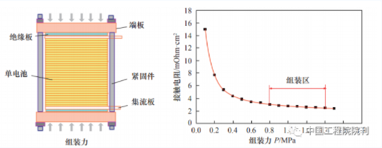 圖 7 電堆組裝力控制與接觸電阻隨著組裝力變化示意圖
