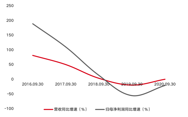 進(jìn)一步分析來(lái)看,若以該公司各年前三季度業(yè)績(jī)數(shù)據(jù)為分析基準(zhǔn),《投資時(shí)報(bào)》研究員注意到,其歸母凈利潤(rùn)同比增速已由2016年前三季度的107.6%大幅下降至2020年前三季度的-21.04%,降幅超120個(gè)百分點(diǎn);同時(shí)間區(qū)間內(nèi),營(yíng)收同比增速也由81.43%驟降至0.27%,降幅超80個(gè)百分點(diǎn)。