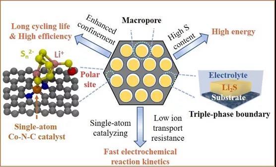 為了解決上述問題,Zhao教授團(tuán)隊(duì)與國際研究人員合作,提出了一種陰極設(shè)計(jì)概念,可以實(shí)現(xiàn)良好的鋰硫電池性能。研究人員將硫均勻地嵌入到高度定向的大孔中,同時(shí)該大孔內(nèi)部嵌有豐富分活性位點(diǎn),以緊緊地吸附多硫化物,消除穿梭效應(yīng)以及鋰金屬腐蝕影響。通過為鋰硫電池提出新型硫陰極設(shè)計(jì)原則,該聯(lián)合小組提升了該電池的能量密度,并為實(shí)現(xiàn)該電池的工業(yè)化邁進(jìn)了一大步。