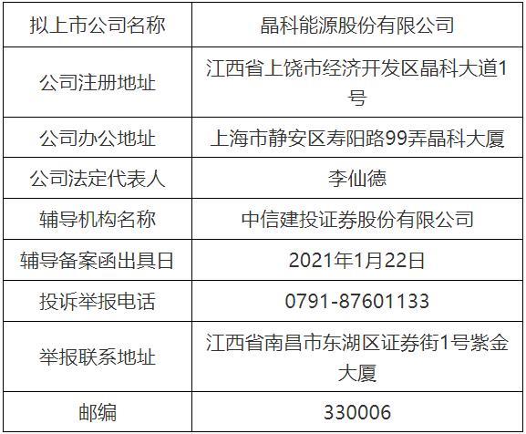 中國儲能網(wǎng)訊:1月29日,江西監(jiān)管局披露了關(guān)于晶科能源股份有限公司(以下簡稱:晶科能源)擬首次公開發(fā)行股票接受輔導(dǎo)的具體信息,其輔導(dǎo)機構(gòu)為中信建投證券,并于1月22日進行上市輔導(dǎo)備案。
