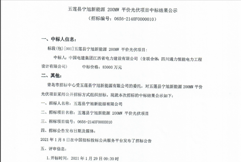 中國(guó)儲(chǔ)能網(wǎng)訊:日前,根據(jù)中國(guó)招投標(biāo)公共服務(wù)平臺(tái)信息顯示,中國(guó)電建江西省電力建設(shè)公司(含聯(lián)合體:四川通力恒能電力工程設(shè)計(jì)有限公司)以總價(jià)8.3億元,單價(jià)4.15元/瓦中標(biāo)五蓮縣寧旭新能源公司200MW平價(jià)光伏EPC項(xiàng)目。具體中標(biāo)公告見(jiàn)下: